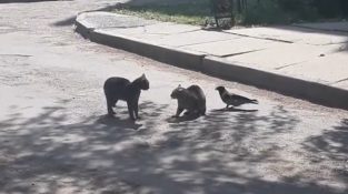 Гарванът се опитва да изчисти две котки борят в квартал в Солигорск Беларус. Докато котките са обърнати един към друг в средата на пътя, Raven се опитва да пришпорят [...]