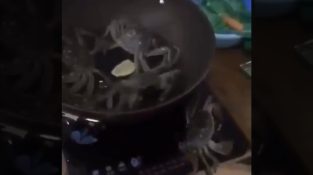 А раци бягства от тигана, който се пече, и излиза и затваря фурната да спаси приятелите си.
