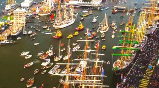 Зашеметяващ забързан на трафик в пристанище Амстердам, по време на събитието 'Sail Amsterdam' на 23 август 2015 г. За събитието, пристанището се събраха много платноходки и увеличаване на трафика [...]