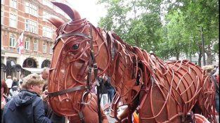 Главният кон от пиесата 'Боевен кон' се разхожда в Лондон. А много реалистичен голям куклен контролира от 3-ма души.