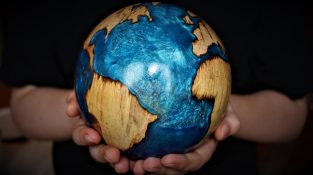 Използване на дървен материал на пън и цветна епоксидна смола, дърводелецът Анди Филип произвежда декоративни глобус.