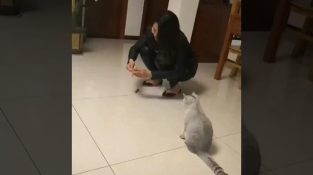Една жена поставя часовников Mouse на земята. Виждайки на мишката, Котката се опитва да хване скачаше на задните си крака като кенгуру.