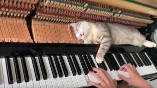 В Haburu котката спи спокойно на механизма, свързан с ключовете на пиано, докато собственикът на Nguyễn Hoàng Мин играе мелодия.