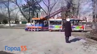 Град Омск Русия, детско влакче минава през парк, свирейки силно метъл песента 'Du Hast' на Rammstein.