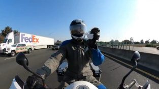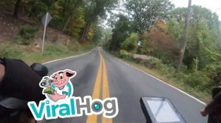 Моторист хваща пластмасова торбичка във въздуха, тъй като води до магистрала.