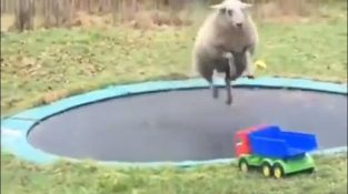 Овца се забавлява, скачайки на батут, в градината на къща.