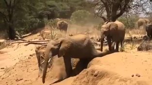 Мама слон показва на малката си как да слезе от малък хълм, за да не падне. Малкото слонче се опита да го направи като мама, но усилията не се изплатиха.