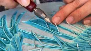 Художникът от Нова Зеландия Хана Дженсън извайва птици върху пано, съдържащо 69 слоя акрилна боя в различни цветове.