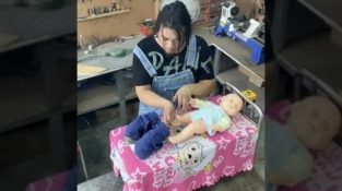 Майсторът Хенди Генг от Китай ни показва новото си изобретение, който използва центробежна сила за автоматично носене на бебешки панталони.