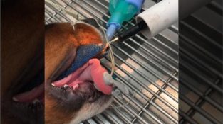 В Букараманга, Колумбия, ветеринарен лекар премахва каишка от устата на куче, което не е имало лоша идея да го приготви за хранене.