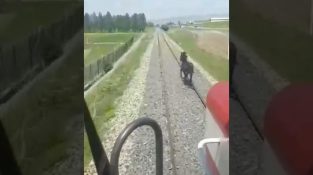 Млад кон е на железопътната линия, когато влак се приближава.