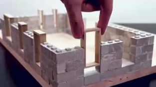 Изграждане на малка тухлена къща, цимент и дърво, като истинска сграда.