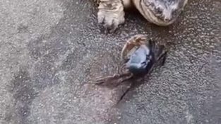 Какво прави този човек в кухнята на ресторанта?; Изглежда, че се опитва да създаде сцена, като слага месо на пода и лежи до него... Всъщност, това е видео, което се възпроизвежда наобратно.