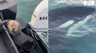 В залива Халибут, Аляска, приближаваща се видра се качва на лодка, за да избяга от кит, който го гони. Както обяснява Джон, собственикът на лодката, преследването продължи доста дълго време [...]