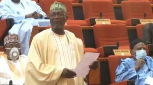 В парламента на Нигерия, Сенатор Абдулахи Адаму (десен) сваля маската си да киха.