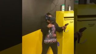 Човек седи на неправилното място в лек автомобил. Докато той е погълнат от смартфона си, получава удар в главата от вратата на кутия, която се отваря при стартиране на влака.