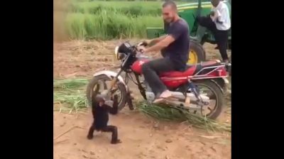 একজন ব্যক্তি একটি ছোট শিম্পাঞ্জিকে তার মোটরসাইকেলের পেছনে চড়ার জন্য আমন্ত্রণ জানাচ্ছেন. কিন্তু ছোট বানর পরে মেশিনে ওঠে, লোকটি তাকে নিচে নিয়ে যায়. তারপর বিরক্ত, শিম্পাঞ্জি মাটিতে হাত মেরে কল শুরু করবে. কিন্তু সে আবার মেশিনে উঠার সাথে সাথে, তিনি অবিলম্বে তার যাত্রা উপভোগ করতে শান্ত হবে.
