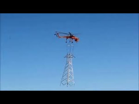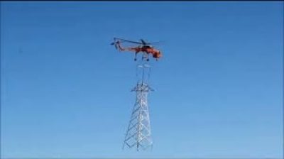 একটি হেলিকপ্টার একটি উচ্চ ভোল্টেজ পাইলন পরিবহন এবং ইনস্টল করে