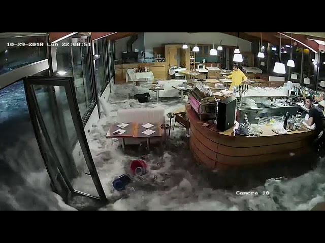 29 অক্টোবর প্রবল বৃষ্টি ও বাতাসের সময়, একটি বড় ঢেউ ইতালির উপকূলীয় শহর আরেনজানোর একটি রেস্তোরাঁর দরজা-জানালা ভেঙে দিয়েছে. ঢেউ রেস্তোরাঁয় প্লাবিত হয় এবং অনেক ক্ষতি করে.