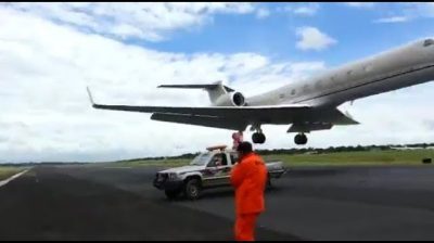 আসুনসিয়ন বিমানবন্দরে বিমান অবতরণ করে, প্যারাগুয়ে যখন কর্মীরা রানওয়ের কাজ করছে