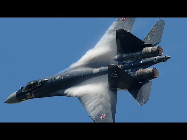 একটি সুখোই SU-35 2013 প্যারিস এয়ার শোতে একটি চিত্তাকর্ষক ডিসপ্লেতে রাখে.