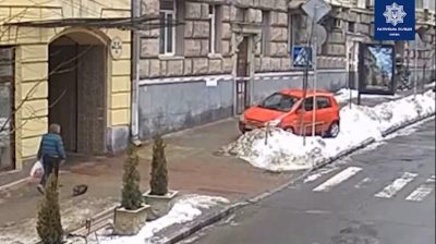 ইউক্রেনের কিয়েভে, একজন চালক তার গাড়ি ফুটপাতে পার্ক করার সিদ্ধান্ত নেন, এবং এমন একটি স্থানে যেখানে বিল্ডিংয়ের ছাদ থেকে বরফ পড়ার বিপদের জন্য একটি সতর্কতা স্ট্রিপ স্থাপন করা হয়েছে.