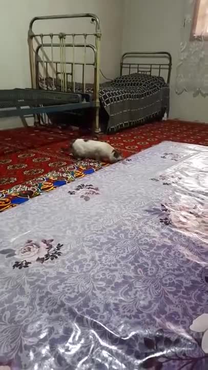 একটি বিস্মিত বিড়াল বিছানার স্প্রিংসের উপর পিছনের দিকে লাফ দেয়. বিড়াল-পালিত প্রভাব.