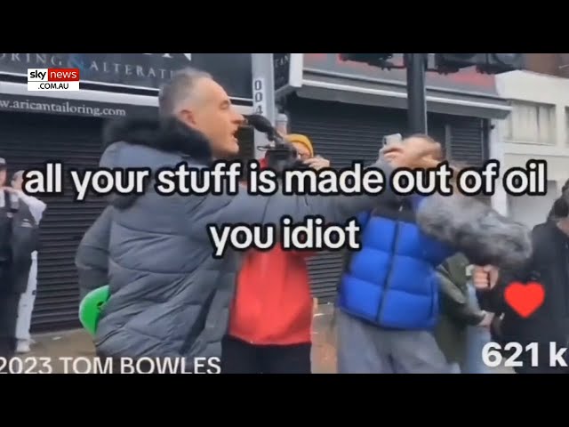 একজন পথচারী 'শুধু তেল বন্ধ করুন' বিক্ষোভকারীদের ভণ্ডামি নির্দেশ করে