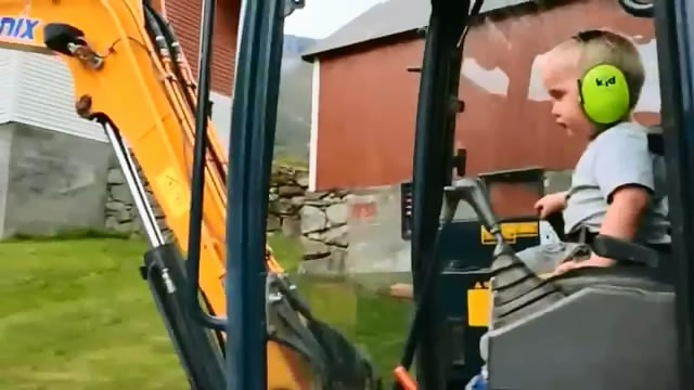 তিন বছরের একটি শিশু একটি খননযন্ত্র চালায়