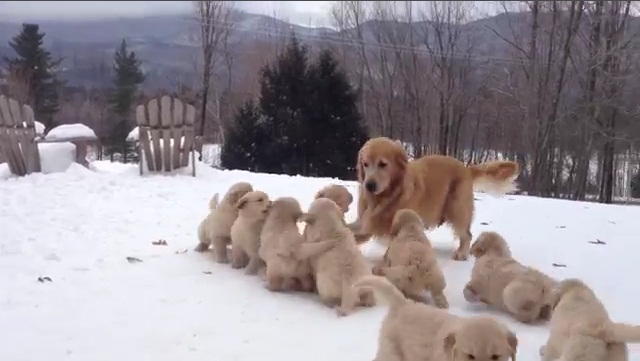 মা তার কুকুরছানাদের সাথে তুষারময় উঠোনে খেলছেন.
