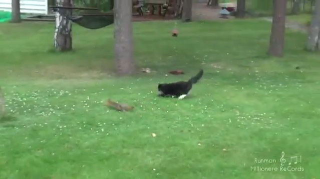 একটি কাঠবিড়ালি চুপচাপ তার খাবার খায়, যখন একটি বিড়াল তার পিছনে এসে তাকে ধরার চেষ্টা করে. ছোট ইঁদুর কিছু চিত্তাকর্ষক কৌশলে পালানোর চেষ্টা করে.