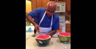 এই লোকটি আমাদের তরমুজ কাটার একটি অনন্য উপায় দেখায়. একটি ধারালো ছুরি এবং সামান্য প্রচেষ্টা সঙ্গে, তিনি খুব দ্রুত এটিকে চামড়া ছাড়াই ছোট রসালো টুকরো করে ফেলেন.