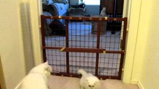 জোয়ি,, 8 সপ্তাহের সিলভার চিনচিলা ফার্সি বিড়ালছানাটি বেড়াতে বাঁধা দিতে অস্বীকার করে, তাই মায়ের অনুপ্রেরণায় বেবি গেটের ওপর দিয়ে পালিয়ে যায়, সোফি
