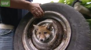ওয়াইল্ডলাইফ এইড ইউকে সদস্য, তারা একটি অল্প বয়স্ক শিয়ালকে সাহায্য করে যেটিকে তার মাথা গাড়ির চাকায় আটকানো অবস্থায় পাওয়া গেছে.