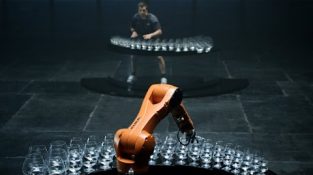 জার্মান টেবিল টেনিস খেলোয়াড় টিমো বোল রোবট KUKA KR AGILUS-এর সাথে দ্বৈত. তারা কাচের বীণা বাজাতে তাদের হাত চেষ্টা করে. কে জিতবে?