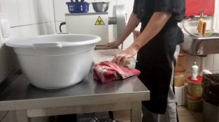 পোল্যান্ডের একটি রেস্তোরাঁর রান্নাঘরে কাজ করছেন একজন ব্যক্তি, রান্নার জন্য প্রস্তুত করার জন্য একটি মাংসের ম্যালেট দিয়ে ছন্দময়ভাবে স্টেকগুলিকে পাউন্ড করুন.