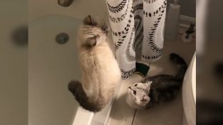 একটি বিড়াল আরেকটি বিড়ালকে বাথটাবে ফেলে দেয়.