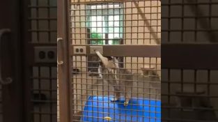 মার্কিন যুক্তরাষ্ট্রের কেনটাকিতে একটি পশু আশ্রয় কেন্দ্রে, একটি র্যাকুন তার খাঁচায় আলো জ্বালানো এবং বন্ধ করে খেলা করে.