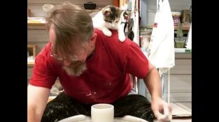 একটি বিড়াল তার কাঁধে বসে তার মাস্টারকে মৃৎপাত্র বানাতে দেখছে