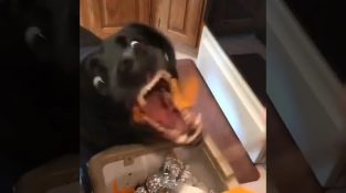 একটি কুকুর রান্নাঘরের বর্জ্যের দিকে পরিষ্কার করা গাজরের খোসা ধরতে এবং খেতে প্রচুর পরিমাণে যায়.