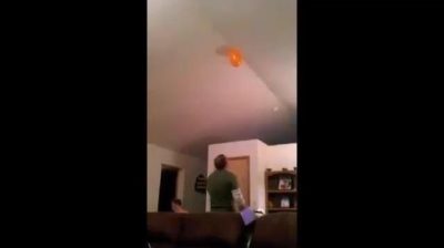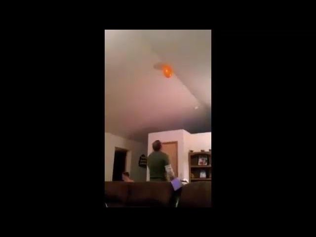 Otec používá riskantní techniku, Chcete-li chytit balon malé dcery, která je přilepená na stropě domu.