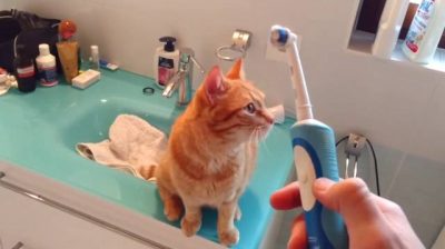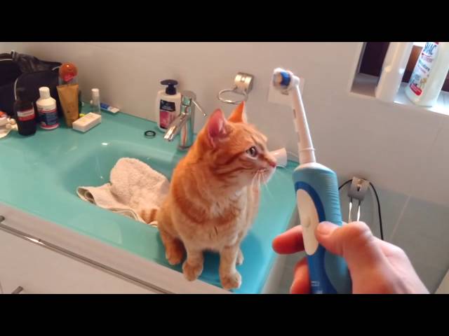 Kočka, která miluje elektrický kartáček na zuby. Teď, když šéf aktivačních událostí, kočka se blíží na výbornou masáž v hlavě.