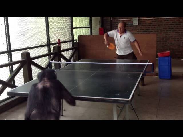 Vyškolení šimpanz hraje stolní tenis proti lidské bytosti.