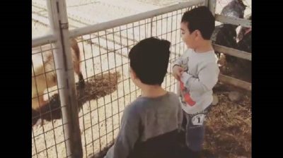 Malý chlapec se snaží napodobit kozu, bít rohy kovovými dveřmi.