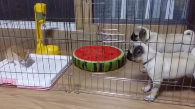 Dva Pug není tak statečná, dostanete malé kotě. Vidět, se blíží, dva Psi štěkají, ale kotě se nebojí pokračovat směrem. Jakmile kotě blíž, Oba psi se bojí.
