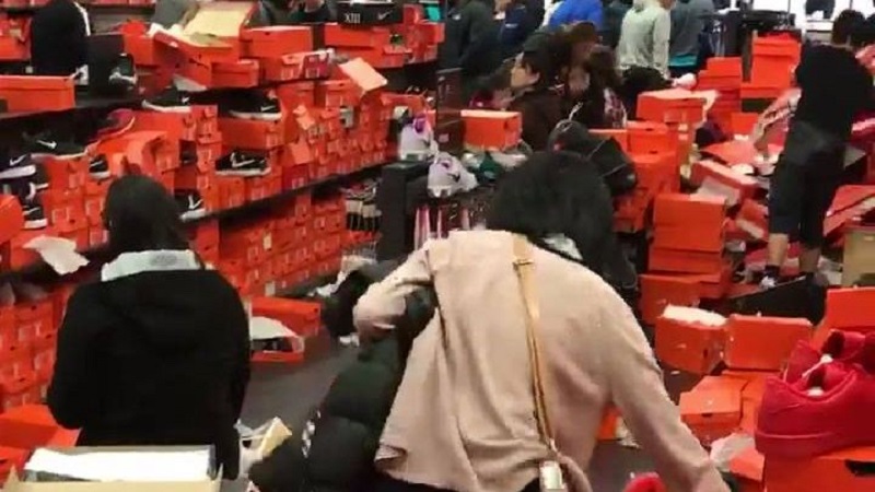 V obchodním domě blízko Seattlu Westchester USA, záznam zákazníka, který je Nike Store po černém pátku. Stovky krabic na otevřené boty a garbage lež na podlaze. Podle Buzzfeed, 20.000 lidé navštívil obchod.