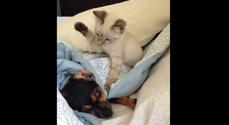 Štěně se snaží odpočívat, zatímco, kotě chce rušit tím, že udeří do hlavy s nohama.