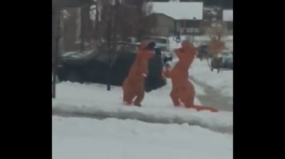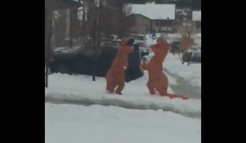 Nošení dinosaur kostýmy, dva lidé hrají koulovačku na silnici.