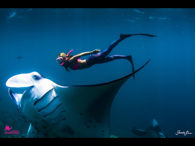 Alison Teal, surfař z Havaje, plave vedle některých obří manty. Tyto obrovské stingrays mohou ftaspyn až 7 metrů a váží asi 2 tuny.