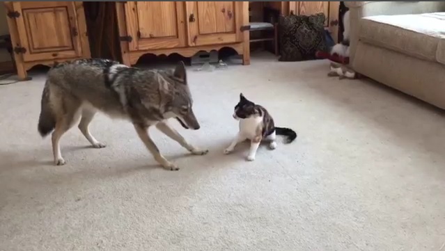 Domestikovaných kojot hraje s kočkou.